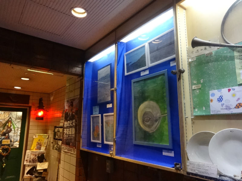 月光荘の絵具や筆を買いに行きながら気になっていたスペースだった。 絵を学び始めた年に何かしらやっておきたいと思い、展示を行うことにした。 ショーケースの実測はしっかりと行って、背景が気に入らなかったので 青い布も買って、ピンの位置も展開図を図面におこして、内容に全精力を注ぐべき だったりするのに、形にこだわるタチがよく出ている。 小画箱の位置が高く、下半分ぐらいが目線のためそれをふまえた構成とした。
