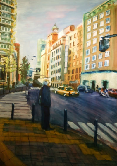 初めての個展のために約18枚を描き下ろした。音楽のアルバムのような 展示にしたかったため、コンセプトとなる絵は既に描き終え、次にいわゆる1曲目と最後の曲をまず 描くことにした。その本編の1枚目。 私はビル群と、15時16時、雨上がりの陽射しが好きだ。 優しく冷たい影と微かな希望のような光を何気なく目を向ける一人の男性。 予感のようなものを描ければと思った。