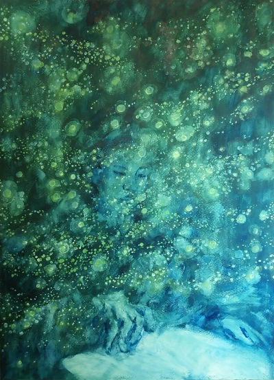 「蛍の光 窓の雪」、「蛍雪の功」をおこがましながらテーマに描いた。 学ぶ自分自身を少しだけ称えてみようかとも思って。 原曲『Auld Lang Syne 』(英訳:old long since)に日本語詞をつけた『蛍の光』、 映画『Waterloo Bridge』に登場する『Farewell waltz』(別れのワルツ)、いずれにしても "別れ"や"再会"が関係している。"last looks"も、表現できていたかは別にしてこの曲をとても意識していた。 「互に思う 千萬の心の端を一言に 幸くとばかり 歌うなり」 幸く;無事に;farewellと、私の名前には別れの成分も含まれているのだと気づき、 小さいころから自然と考えていたことでもあるから、そのひとかけらでも描いてみようと思った。