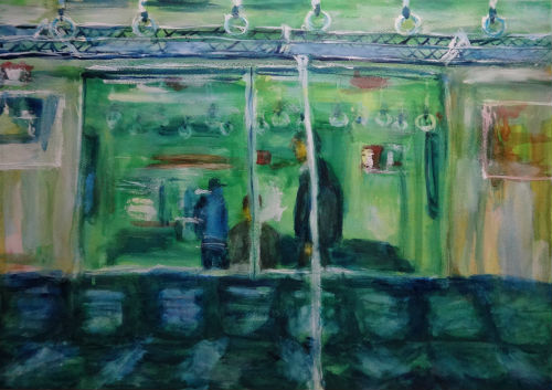個展"last looks"のために最初に描いた作品。 電車に乗ってそれぞれのプラットフォームに降りていく居る姿をいつも見送っている。 人はこの世にたくさんいるのに、私は私の世界しか見えないのに、 それ以外にひとつひとつの人生があること、ひとつから繋がるそのまたひとつが存在し 生きているということ、それを不思議な気持ちで冷めたような感慨深いような目で見ている。 通勤・通学・移動手段の電車だから二度と会わないことは案外無かったりすると 思っているけど、私から送る最後の視線として描いた。