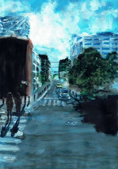 8か月と8日の習作の日々を経て私の表現を試みた、たぶん一作目。 そういった意味の"opening"の意識なく描いていたけど、描き終えてみると、わくわくするような "始まり"を感じたのでこのタイトルになりました。 空を見上げて綺麗に感じるなんて、救いのない日々のなかで心が健やかなる証拠のような気もするけど、 ここの、建物の間から垣間見える光はやっぱり特別なのです。そして影と光のコントラストが好きなんだな私は。 その気持ちを伝えたいと思いました。