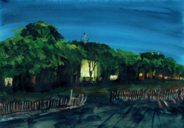 灯り window 2016年11月 420×297 / A3 / 画用紙、水彩 この駐車場の照明を選んだ人が電球色?を選んでくれて良かった。 早朝でも昼間に感じるような暖かみを青色の中の四角い窓から感じさせてくれる。